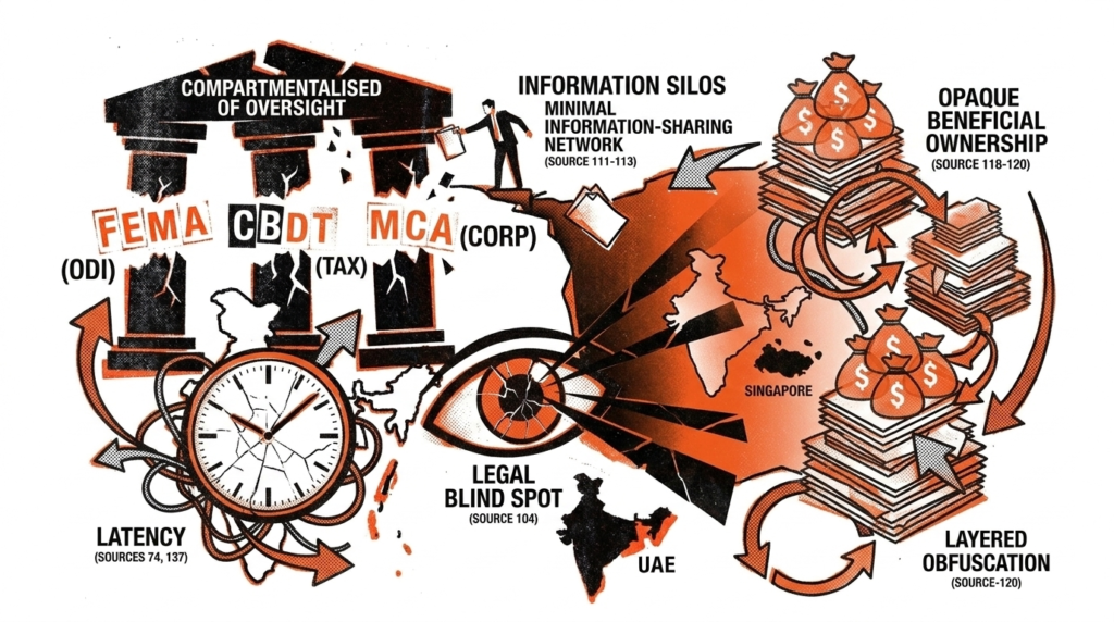 One of the most foundational weaknesses in India’s regulatory infrastructure lies in the compartmentalisation of oversight. The Reserve Bank of India governs capital flows under the ODI regime; the Central Board of Direct Taxes (CBDT) interprets and enforces tax treaties and anti-avoidance norms; the Ministry of Corporate Affairs (MCA) handles beneficial ownership disclosures under the Companies Act; and the Securities and Exchange Board of India (SEBI) supervises foreign portfolio investment mechanisms like participatory notes. Nevertheless, these agencies use institutional silos and are involved in a minimal information-sharing network, and fail to integrate a cross-regulatory intelligence structure. This contributes to an atmosphere whereby, in case one authority sees abnormalities in the framework or possession, this knowledge is unlikely to prompt synchronized regulation in other authorities. A firm can receive a clean bill of health in ODI procedural filings in the same breath as a violation of the GAAR, only to be told that there is no single point of institutional contact to fill in the gap.