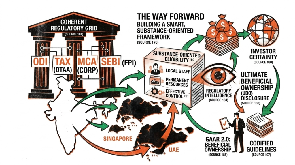 India’s regulatory response to cross-border corporate structuring has long suffered from a problem of posture; it focuses more on control than comprehension. Other nations whose exposure to capital flight and treaty abuse situations is comparable have turned to economic substance, whereas in India, the legal tactic is so procedural and responsive. The solution then is not to impose newer constraints on outbound investors, but to pursue a smarter, integrative-driven architecture that utilizes economic signaling, digital transparency, and legal certainty. India has lacked any legislative coverage but strategic convergence. To be able to take a modern structuring regime as a foundation thereof, three major pillars have to be used: cross-institutional coherence, substance-oriented eligibility, and investor certainty.